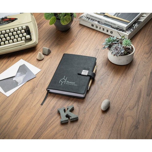 Agenda B5 em pele reciclada (58%) com fecho magnético. Está organizada num plano semanal. Inclui suporte para esferográfica (incluída) e marcador em fita. Fornecida com bolsa de non-woven. 175 x 245 mm | Bolsa: 220 x 270 mm