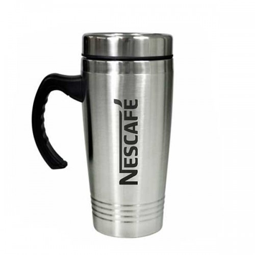 Descrição: Caneca inox de 450ml, pegador de plástico e parte interna em inox. Possui tampa com compartimento que pode ser aberto para beber(não é térmica).