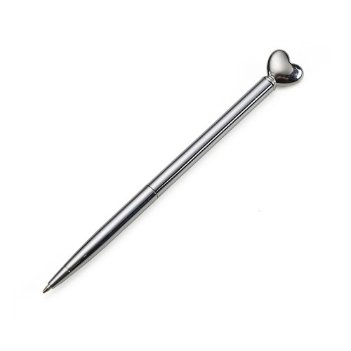 Descrição: Caneta metálica coração, acionamento por rotação e carga esferográfica na cor azul.