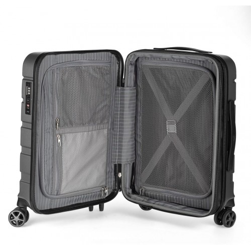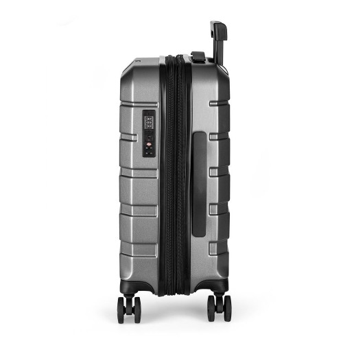Sistema de carrinho de aço; Alça de mão na lateral e na parte superior; Possui expansor integrado; Possui cadeado TSA; Entrada USB; Cadeado com senha/segredo; Quatro rodas de 360 graus;